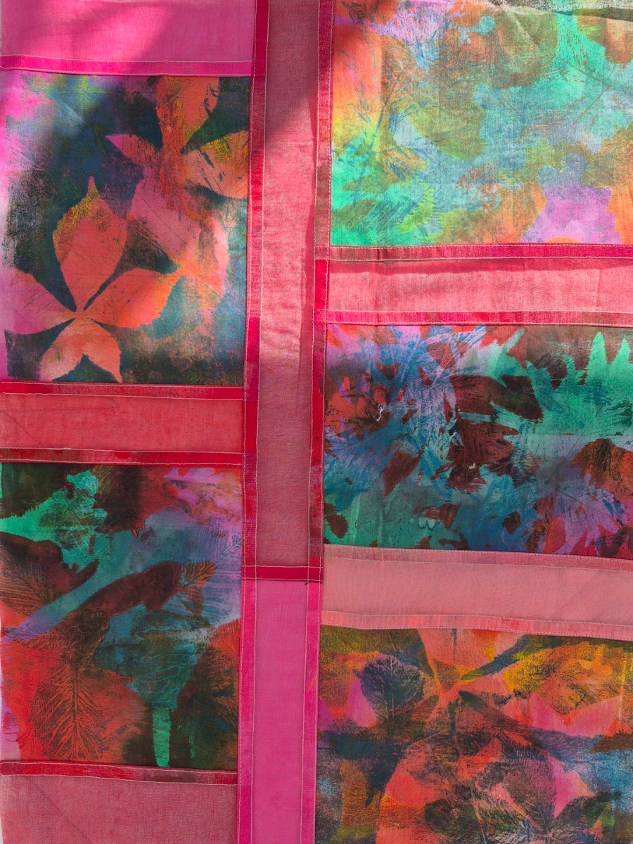Work with a commercial fabric and sheer organzas to create a panel of contrasting colour and texture. Use of heat tools* and free motion embroidery. Optional hand embellishment.